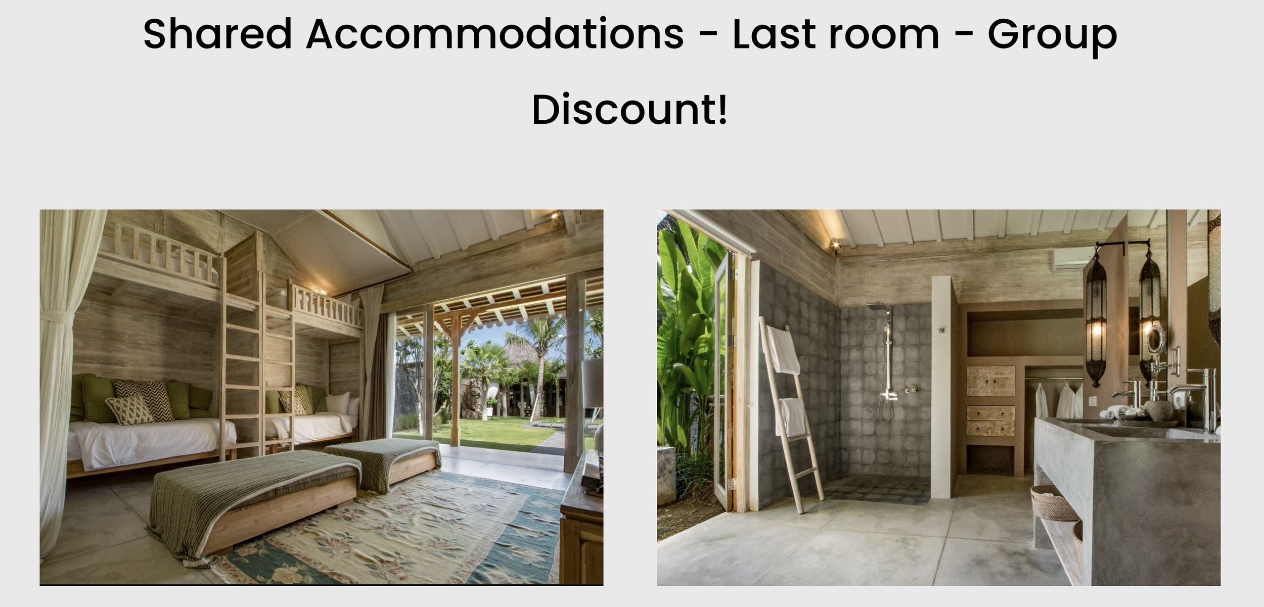 Choose from six beautiful room options designed to fit your ideal retreat experience. Enjoy the privacy of a king-bed suite or the camaraderie of a shared bunk room with up to four guests. Spots are limited—reserve your perfect space today and make this Bali retreat unforgettable!